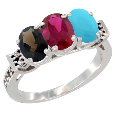 10K White Gold Natural Smoky Topaz, Enhanced Ruby & Natural Turquoise Ring 3-Stone Oval 7x5 mm Diamond Accent, sizes 5 - 10