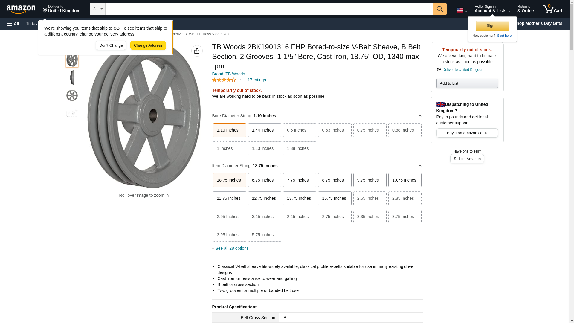 TB Woods 2BK1901316 FHP Bored-to-size V-Belt Sheave, B Belt Section, 2 Grooves, 1-1/5" Bore, Cast Iron, 18.75" OD, 1340 max rpm