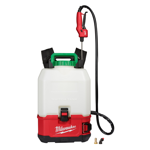 IMPORTANT: This item cannot be accepted for a return unless it is unused and in its sealed original packaging. Please contact your local Milwaukee service center for repair or replacements of this item post purchase. <br /> INCLUDES: <br /> • (1) M18™ SWITCH TANK™ Powered Base<br /> • (1) SWITCH TANK™ 4-Gallon Sprayer Tank Assembly<br /> • (1) Stainless Steel Wand<br /> • (1) Adjustable Nozzle<br /> • (1) Fan Nozzle<br /> • (1) Angled Nozzle Adaptor<br /> FEATURES:<br /> • Interchangeable Tanks, No Manual Pumping<br /> • Add-on and Interchange Tank Assembly to Eliminate Cross-Chemical Contamination<br /> • Replaceable Tank Assembly Delivers Lower Cost of Ownership<br /> • Instant, Constant and Adjustable Pressure for Ultimate Control<br /> • Up to 120 PSI & 25' Spray Distance<br /> • Run-time: Up to 12 tanks per charge with M18™ REDLITHIUM™ XC3.0 Battery<br /> • Critical seals: Viton® for increased durability against chemicals<br /> • Dual Diaphragm Pump: For Longer Pump Life<br /> • Wide Mouth Opening and Strainer: For Easier, Debris Free Pouring<br /> • Wide Straps for Comfort During Extended Duty Cycles<br /> • Transport Handle for Convenient Transport and Storage
