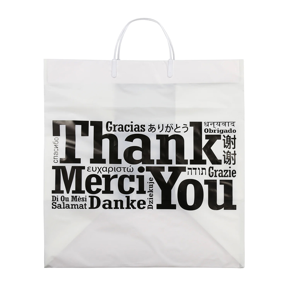 14" W x 15" L + 10" BG x 2 mil Printed Multilingual "Thank You" Takeout Bags with Rigid Handles - Case of 100