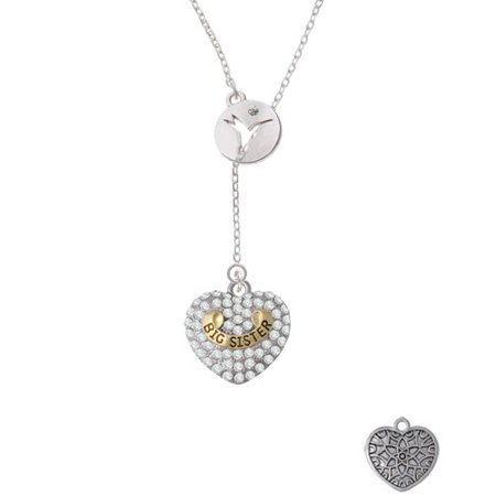 Gold Tone 'Big Sister' on Clear Crystal Heart Hummingbird Cutout Disc with Clear Crystal Lariat Necklace. Imitation Rhodium Plated & Gold Tone Charm. Charm size is approx. 0.86 x 0.85 x 0.20 inches (HxWxD) including loop. Hummingbird Disc Charm is approx. 0.63 x 0.53 x 0.07 (HxWxD) including loop. Necklace is adjustable from 18 to 20 inches. Lobster Claw Clasp. Featured necklace is an exclusive Delight & Co. design. We are a family owned company for over 35 years in the U.S.A. PLEASE NOTE: Our products are lead safe, but are not intended for children 14 years and younger.