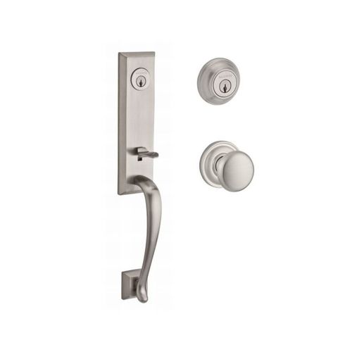 Baldwin Reserve DCDELXROUTRR150 Double Cylinder Del Mar Handleset with Round Knob and Traditional Round Rose with 6AL Latch and Dual Strike Satin Nickel Finish