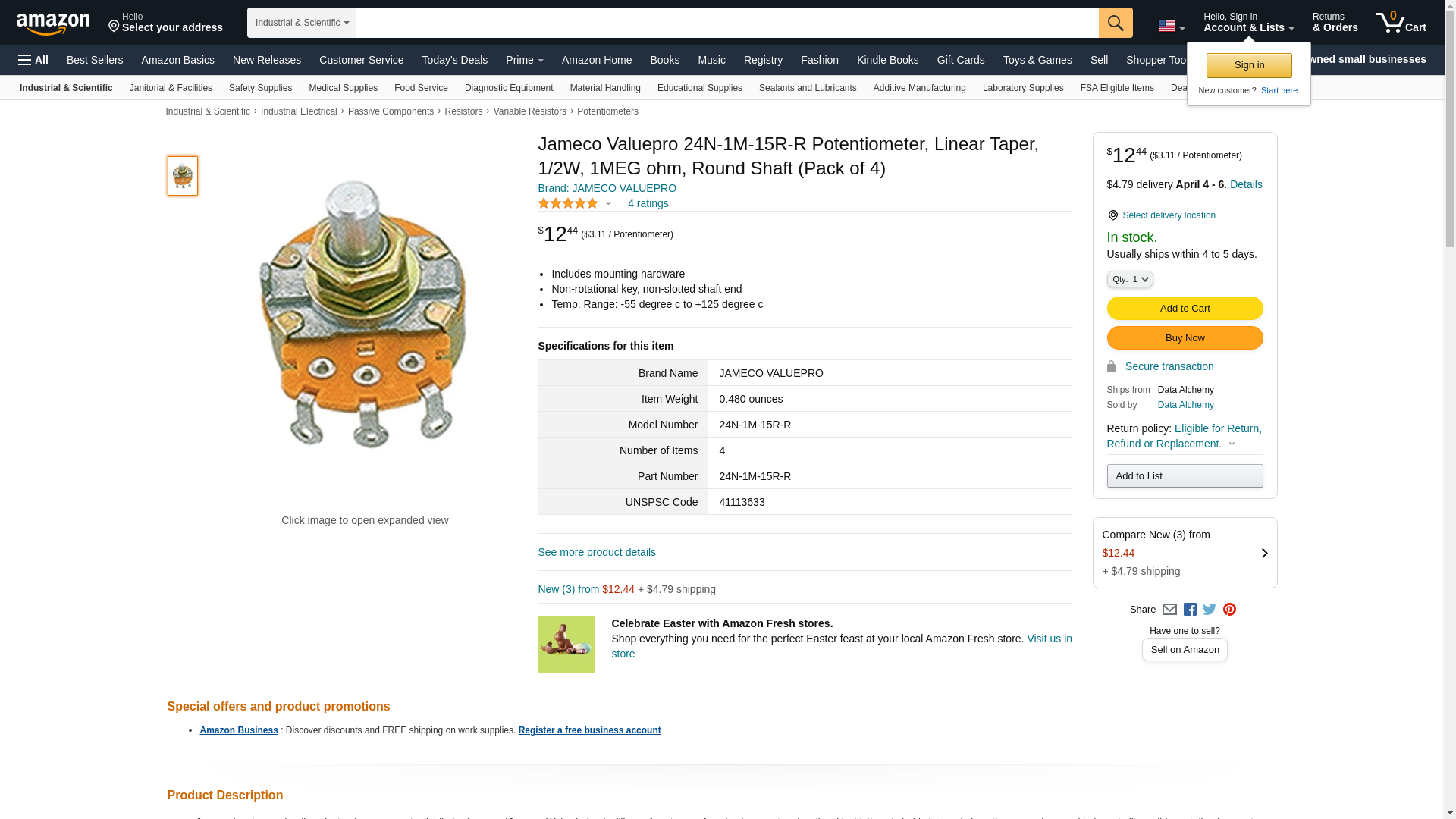 Jameco Valuepro 24N-1M-15R-R Potentiometer, Linear Taper, 1/2W, 1MEG ohm, Round Shaft (Pack of 4)