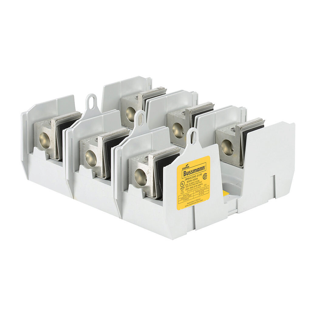 JM60200-1CR-3 - Bussmann modular fuse block, accepts J fuses, 200A, 600V, 3-pole, 6 AWG-250 MCM copper or aluminum, box lug, panel mount.