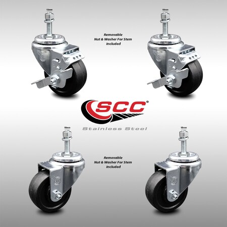 3 Inch SS Soft Rubber Wheel Swivel 10mm Threaded Stem Caster Brake SCC, 2PK