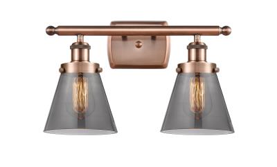 INNOVATIONS LIGHTING 916-2W-AC-G63-LED Small Cone 2 Light Bath Vanity Light part of the Ballston Collection. Collection: Ballston. Metal Finish (Body): Antique Copper. Metal Finish (Canopy/Backplate): Antique Copper. Glass or Metal Shade Color: Plated Smoke. Material: Steel, Cast Brass, Glass. Shade Material: Glass. Dimension(in): 11(H) x 16(W) x 7.5(Ext). Backplate Dimension(in): 4.5(H) x 6(W) x 0.75(D). Shade Size(in): 6(H) x 6(Dia). Bulb: (2) 3.5 Watt LED Vintage Medium Base Bulb Included. Voltage: 120. Dimmable: Yes. Color Temperature(Kelvin): 2700. CRI: 82. Lumens: 350. Glass Type: Frosted. Glass or Metal Shade Shape: Sphere. Shade Fitter Measurement: Neckless with a 2.125 inch Hole. Style: Industrial, Modern Contempo, Restoration-Vintage, Transitional . Ul Certification Type: Damp Location. Warranty: 2 Year Finish, Lifetime Electrical.