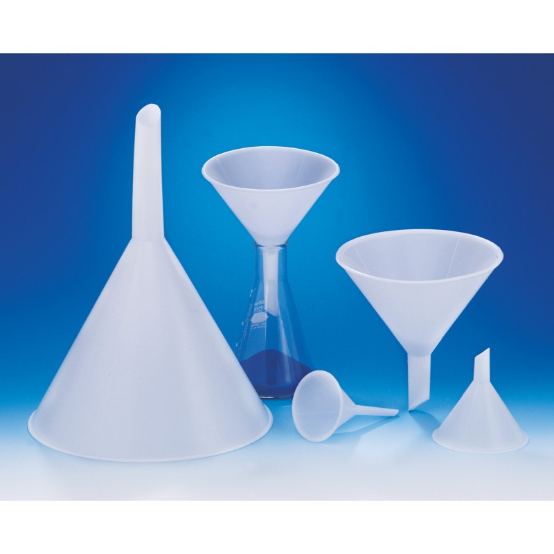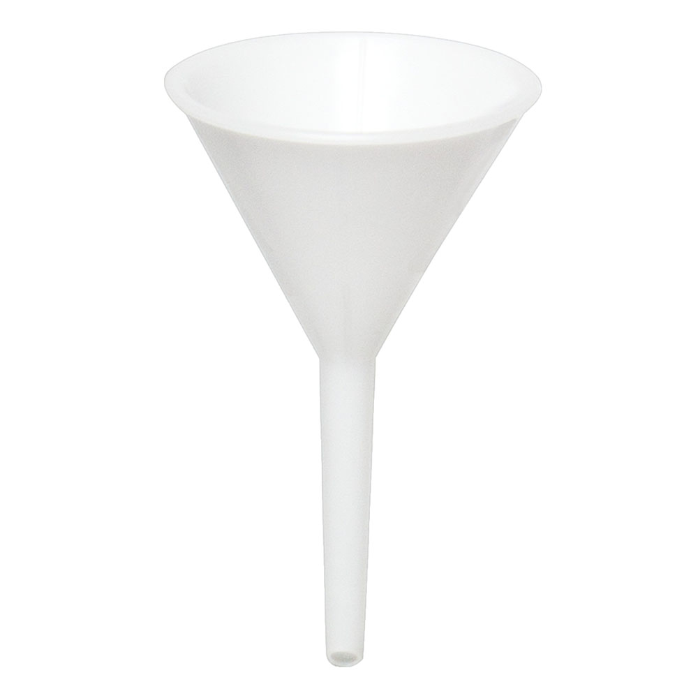 <p><strong>90ml Heavy Duty Funnel</strong></p><p>These heavy duty funnels are useful for all laboratory work. They are chemical resistant and steam sterilizable at 121° C (250° F). Wide mouth for safer liquid handling.</p><p><strong>Features</strong></p><ul><li>External molded ridges avoid air lock with container</li><li>Diameter (mm): 76.2 (3")</li><li>Stem I.D. (mm): 6.4 (1/4")</li><li>Stem O.D. (mm): 11.1 (7/16")</li><li>Stem length (mm): 69.9 (2-3/4")</li><li>Total length (mm): 127.0 (5")</li><li>Volume: 90ml (3oz) </li></ul>