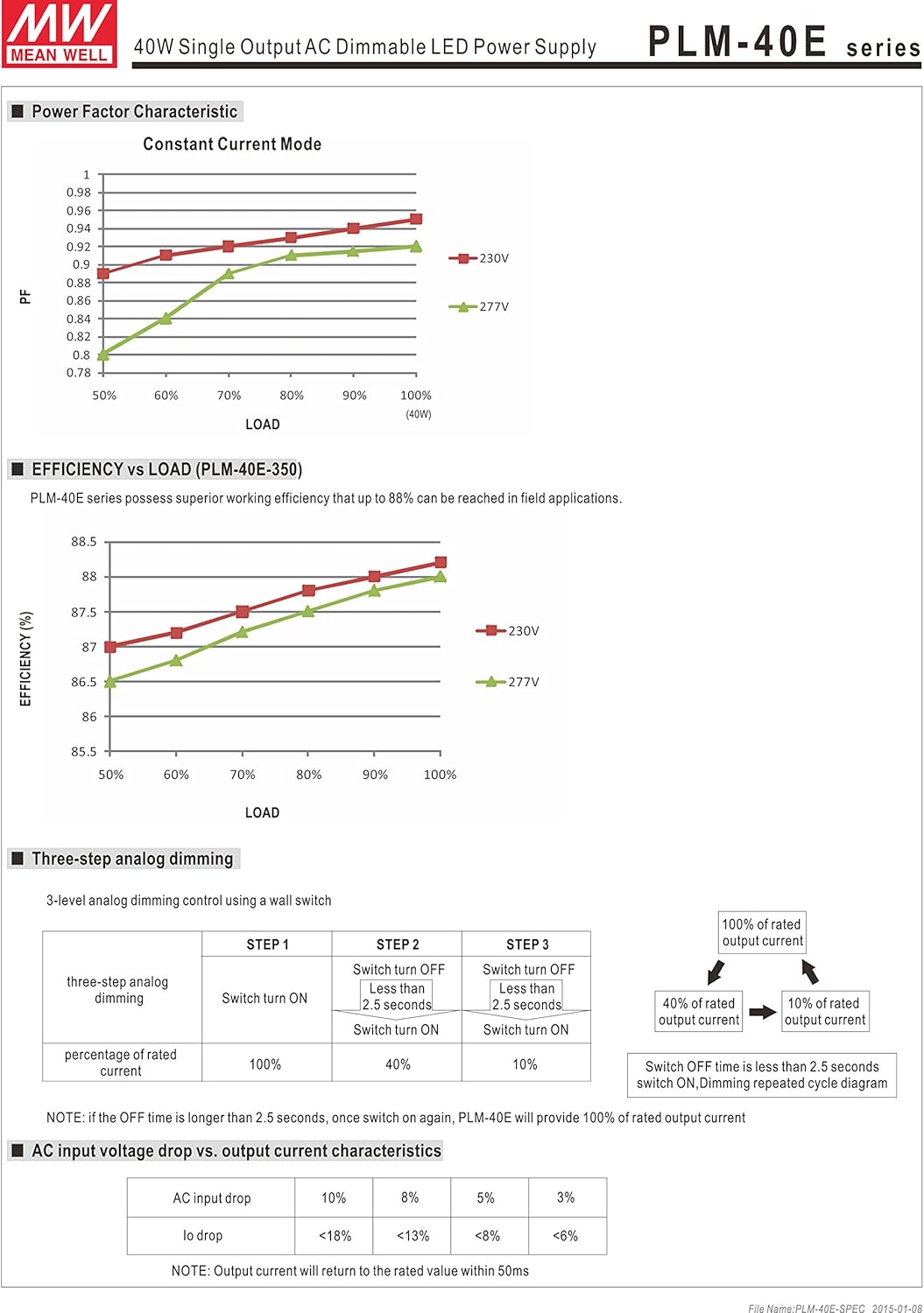 <b>Features</b><br>Constant current mode<br>110~295VAC input<br>No load power consumption <0.5W<br>Fully isolated plastic case with push terminal style I/O<br>Three-step analog dimming function (PLM-40)<br>IP30 design<br>Isolation class II, no F.G.<br>Class 2 power unit (except for PLM-25-350 & PLM-40)<br>Low cost, high reliability<br>Suitable for indoor LED lighting applications<br>Protections: Short circuit / Over temperature (PLM-40)<br>2 years warranty