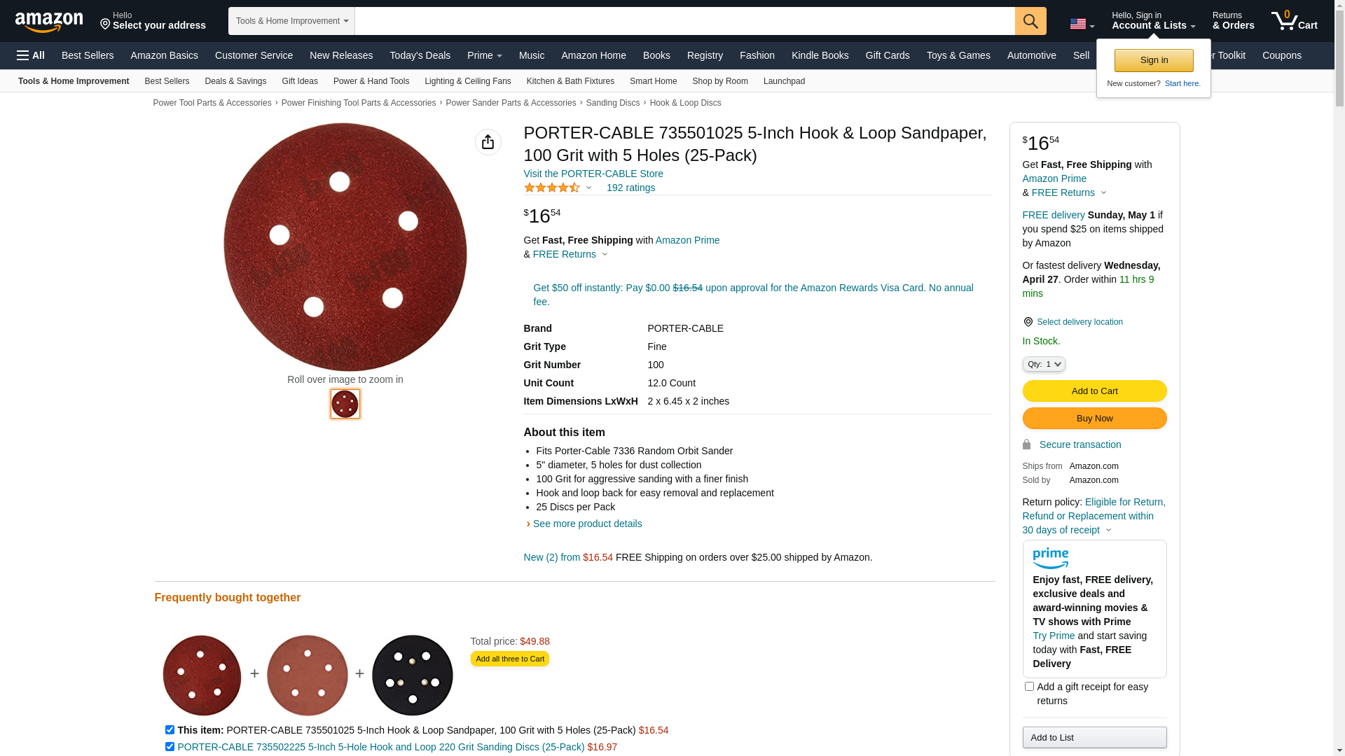 5" HOOK & LOOP SANDING DISCSUnit Sold: 1 PackPart Number: 735501025Manufacturer Name: PORTER CABLE CORPUPC: 885911089197Resin coated to resist heat & humidity Made with aluminum oxide grain Hook & loop fastening system Use on wood, metal, fiberglass, plastic & paint Fits: Random orbit sandersWeight (lbs): 0.61 Length (in): 5.25 Width (in): 1.5 Height (in): 5.75GRIT:100QTY/PK:25
