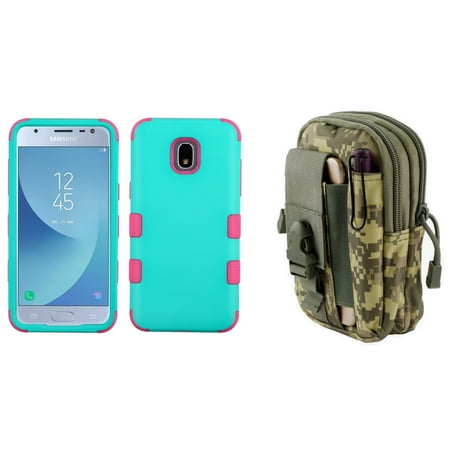 TUFF Series Hybrid Heavy Duty [Military Grade Drop Tested] Case (Teal and Pink) with ACU Camo Tactical EDC MOLLE Waist Bag Holder Pouch and Atom Cloth for Samsung Galaxy J3 J337 (2018)
