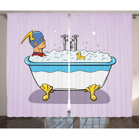 Comics Decor Curtains 2 Panels Set, Superhero Fast Furious Relaxing in Bubble Bath Shower with Rubber Duck Artwork, Window Drapes for Living Room Bedroom, 108W X 90L Inches, Multicolor, by Ambesonne