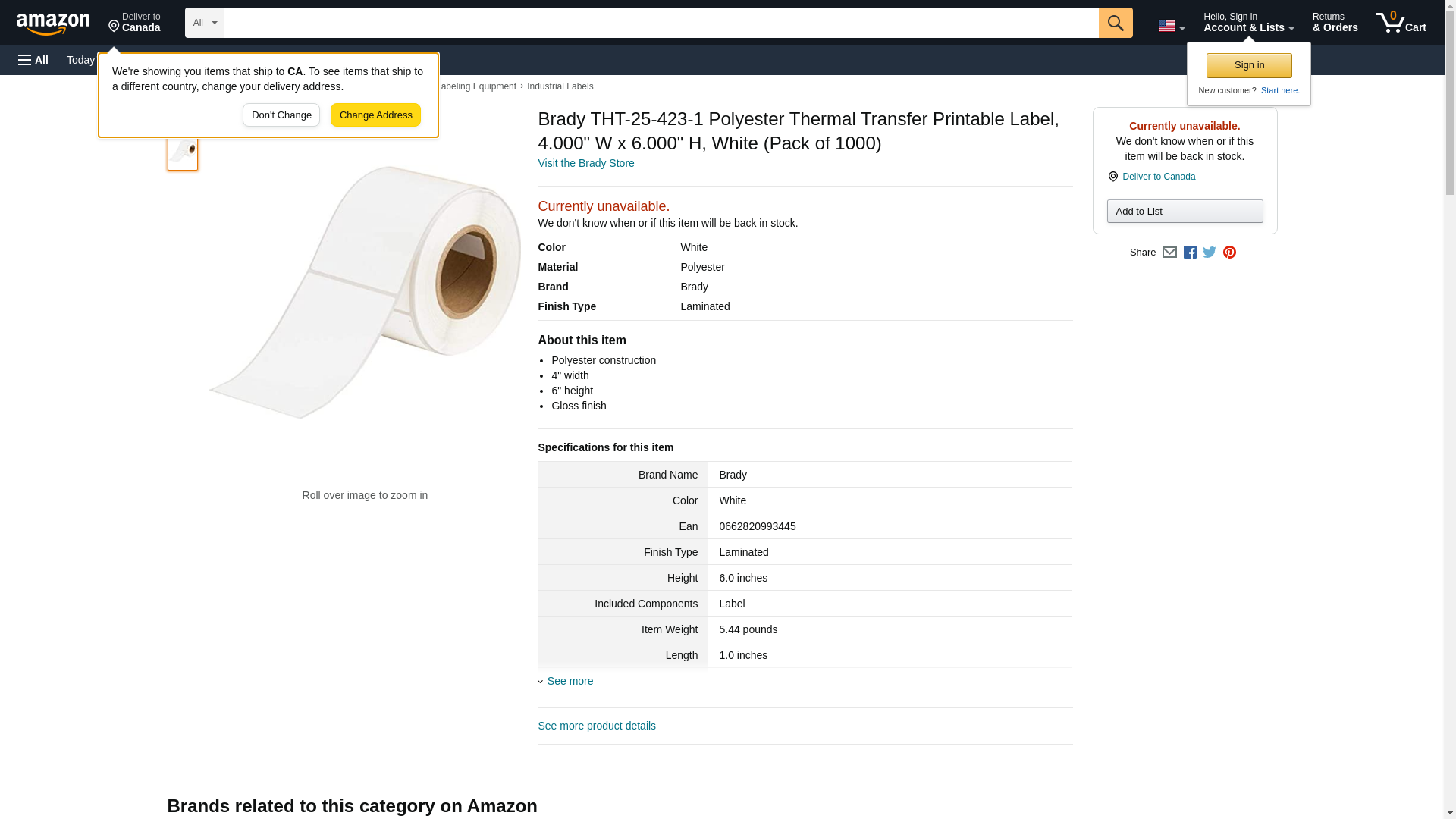 BRADY THT-25-423-1 THT Series 4"x 6" White polyester Thermal Transfer Printer Labels 1K/Roll - 1 item(s)