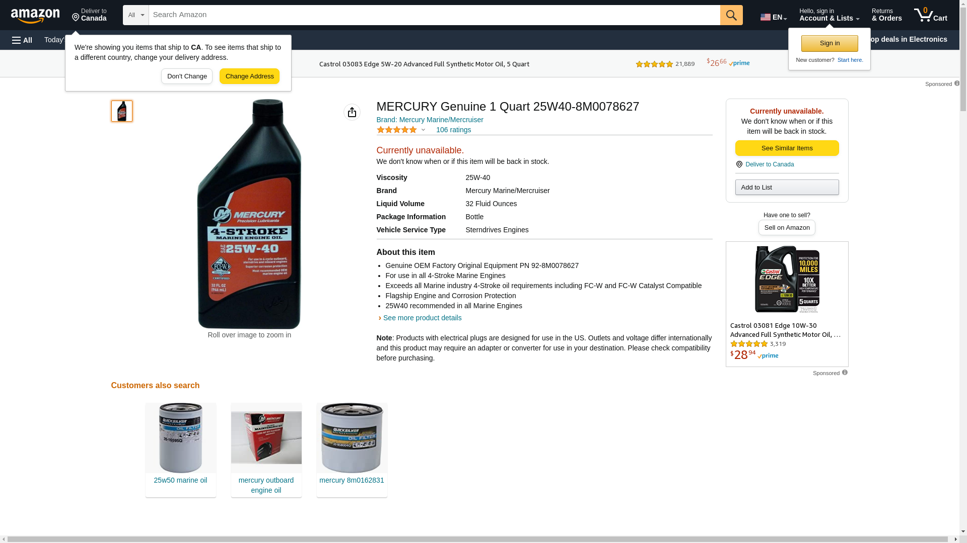 Mercury's all new 4‑Stroke oil technology outperforms automotive oils in marine applications because of its specialized additive package designed for marine engines. <br><br> 3 things to know: <br><br> For use in all 4‑Stroke Marine Engines ‑ New formula 4‑Stroke oils are engineering approved for all marine 4‑Stroke applications, including: Outboard, MerCruiser, High Performance, Stern Drive/Inboard, and exceeds all Marine industry 4‑Stroke oil requirements including FC‑W and FC‑W Catalyst Compatible. <br> Flagship Engine and Corrosion Protection ‑ Industry leading strength and viscosity retention and ultimate corrosion and wear protection. <br> The most recommended Marine Oil ‑ Over 5 years of engineering and development by the largest marine engine manufacture in the world. 25W40 recommended in all Marine Engines.<br><br> Size: Case of 6 Quarts