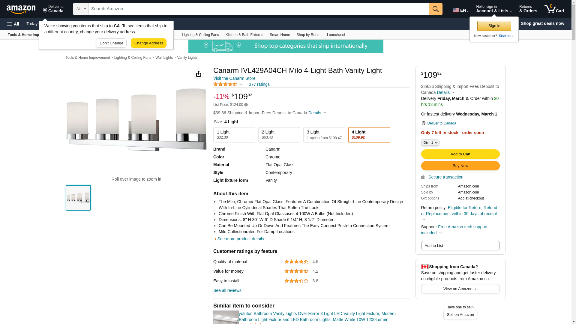Canarm IVL429A04CH Milo 4-Light Bath Vanity Light, Chrome
