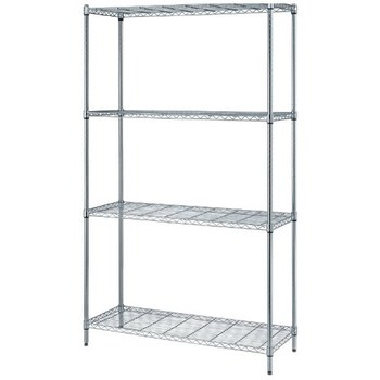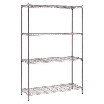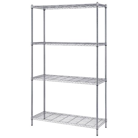 | Feature | Four-tier standing wire shelving unit has four shelves and is made of chrome-plated carbon steel for strength, durability, and to resist dirt buildup and corrosion |