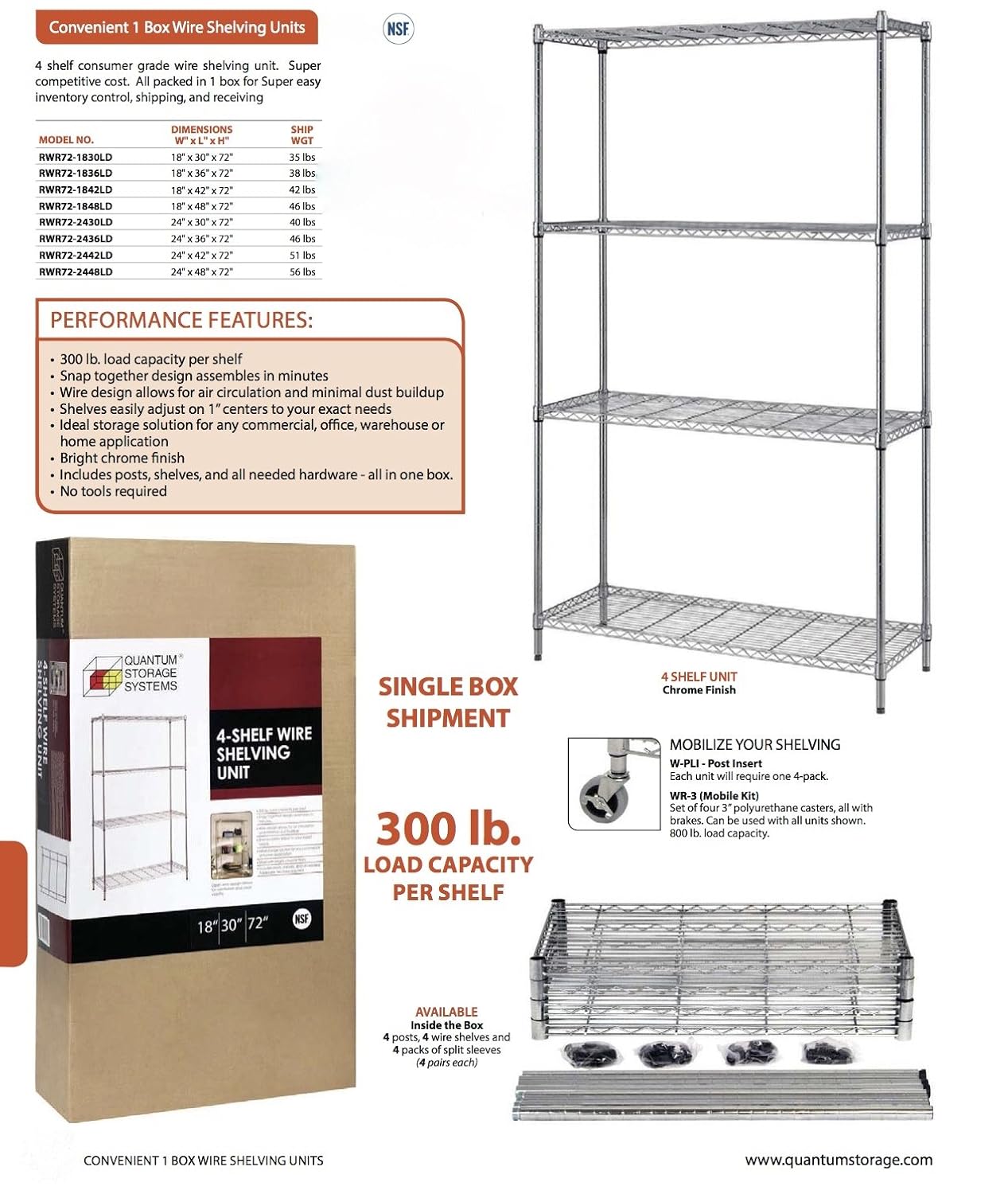 Quantum Storage Systems RWR72-2448LD Economy Four Shelf Wire Shelving Unit 24 x 48 x 72 This wire shelving unit offers a bright chrome finish for easy cleaning and the wire shelf allows for air circulation with minimal dust buildup. Ideal storage solutions for any commercial office warehouse school or home. Designed to store lighter weight items boxes totes and bins. Includes: (4) snap together post with leveling feet and post caps (4) wire shelves (4) sets of plastic shelf sleeves (one set for each shelf). Unit ships in one single box saving you time and money. RWR72-2448LD
