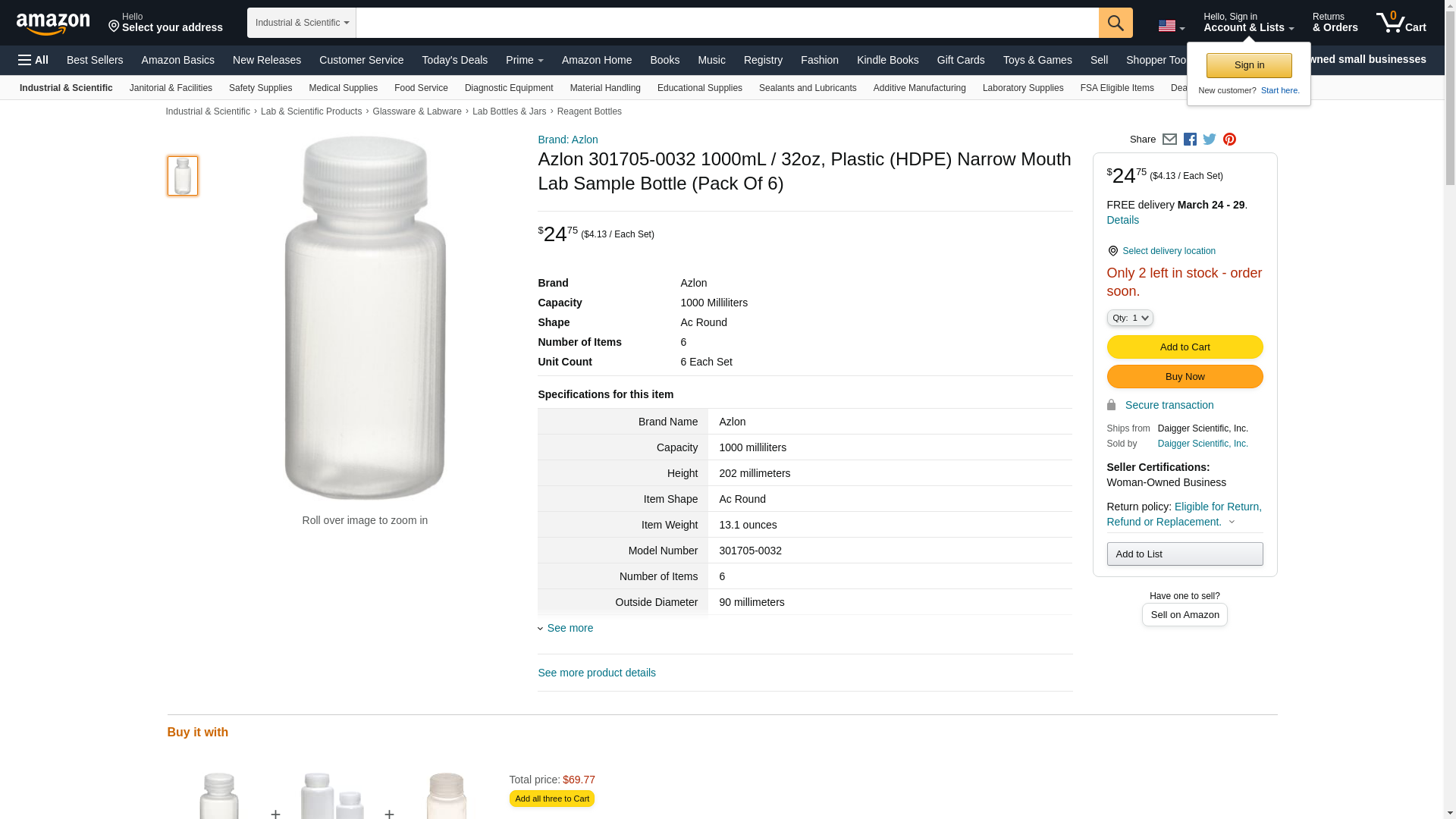Azlon 301705-0032 1000mL / 32oz, Plastic (HDPE) Narrow Mouth Lab Sample Bottle (Pack Of 6)