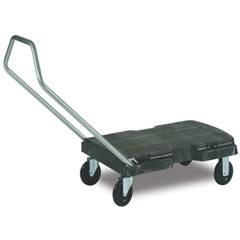 The Rubbermaid Commercial Triple Trolley efficiently transports large bulky loads and then folds flat for easy storage. The trolley has a sturdy structural foam deck that won't rust, dent, chip, or peel. The 3-position handle allows the user to push, pull, or fold flat for use as a dolly. Tough plastic construction is easy on walls and doors. The 5-inch casters are non-marking. Color: Black; Capacity (Weight): 500 lbs.; Caster/Glide/Wheel: Two 5" TPR Fixed-Position Casters; Two 5" TPR Swivel Casters; Material(s): Structural Foam.