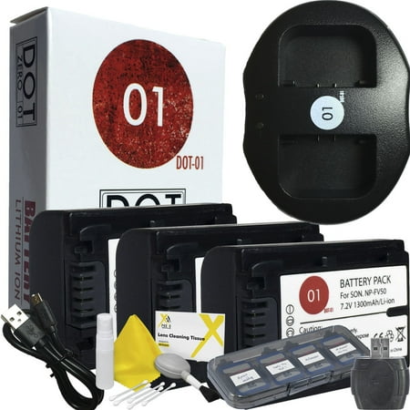 <b>This DOT-01 Package includes:</b> <br /> <br /> 3x DOT-01 Brand 1300 mAh Sony NP-FV50 Replacement Rechargeable Batteries made with Premium Japanese Cells <br /> 1x DOT-01 Brand External Dual Slot USB Charger - Charge Two Batteries at Once via USB <br />5 Year DOT-01 Battery Warranty <br /> 1x SDHC/MicroSD USB Card Reader/Writer <br />1x 8-Slot SDHC Memory Card Case <br />1x Blower Brush <br />1x Soft Lens and Screen Fiber Cloth <br />1x Lens Cleaning Fluid <br />1x Lens Cleaning Tissue <br />5x Cotton Swabs <br /> <br />This DOT-01 Package was made to compliment the Sony FDR-AX33 Camcorder <br /> <br /> <b>More about DOT-01 Products:</b> <br /> <br /> DOT-01 products are made with you in mind. We have done our best to make a reliable and an affordable product for both the beginner and professional photographer alike. Whether you are heading out on an expedition to the West Indies or beginning a new chapter of your life at home, <b>DOT-01 is behind you</b> with the power you need to catch every moment. <br /> <br />We support you and your new batteries for FIVE full years after your purchase date. If you want to drop a compliment our way, or if you have a comment for us, we are available five days a week for you. <br /> <br />Please Note: <br />If you are planning a trip somewhere extra COLD or HOT <i>(Dog sledding in the arctic circle, cycling down an active volcano, or whatever you are into these days)</i> Lithium Ion batteries have a much shorter lifespan in extreme weather, so please, plan accordingly!