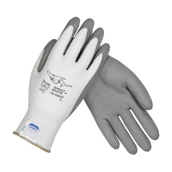 | Feature | Protective Industrial Products\xae 2X GREAT WHITE\xae 13 Gauge Medium Weight Cut Resistant Gray Polyurethane Palm And Fingertip Coated Work Gloves With White Seamless Liner And Continuous Knit Cuff |