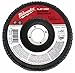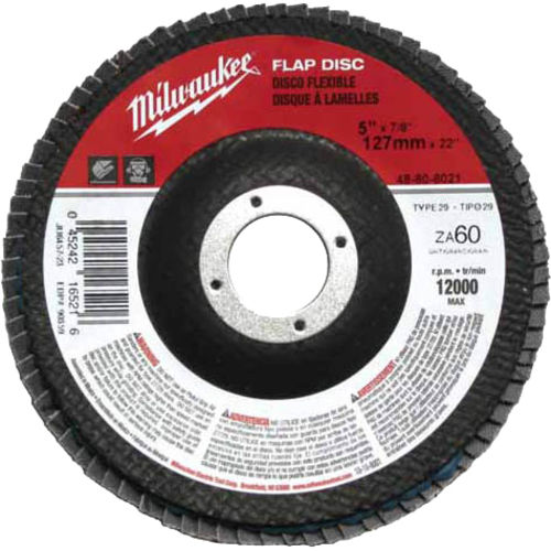 Milwaukee Flap Discs grind and finish in one operation. They are manufactured using a high performance Zirconia grain that outlasts standard Zirconia and Aluminum Oxide grains by up to 30%. Milwaukee Flap Discs are available in 36, 60, and 80 grit and come in the following diameters/configurations: 4-1/2 in. (Type 27, Type 27 Extra-Thick and Type 29), 5 in. (Type 29) and 7 in. (Type 29).FEATURES: Versatile - grinds and finishes. High performance Zirconia grain for longer life than standard Zirconia or Aluminum Oxide. Flat (Type 27) and Conical (Type 29) design configurations. Lasts up to 15% longer than Fiber Discs