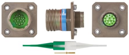 Sealing: Meets IP67<br>Shielding: Yes<br>Connector Type: Circular<br>Connector Style: Receptacle<br>Mounting Type: Wall - Front Mount - Thru Holes<br>Number of Contacts: 13<br>Contact Style: Pin<br>Termination Method: Crimp<br>Crimp Wire Gauge: 28, 26, 24, 22<br>Insert Arrangement: 11-35<br>Contact Size: 13#22D<br>Contacts Supplied: Yes<br>Contact Material: Copper alloy<br>Contact Plating: Gold over nickel<br>Shell Material: Aluminum<br>Shell Plating: Olive drab cadmium<br>Shell Color: Olive Drab<br>Insert Material: Thermoplastic<br>Grommet Seal Material: Silicone<br>Amperage Rating: 5A<br>Operating Temperature: -85 to +347 (-65 to +175)<br>Contact Mating life: 500<br>RoHS: No<br>Insert Rotation Keying: N