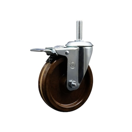 High Temp Phenolic Swivel Threaded Stem Caster w/5" x 1.25" Brown Wheel and 5/8" Stem & Total Locking Brake - 300 lbs Capacity/Caster - Service Caster Brand