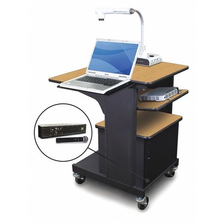 | Feature | "Construction: Unit: Steel. Platform Surface: Oak High Pressure Laminate. Finish: Dark Neutral Powdercoat Paint/Oak Laminate. Amplifier Module: 16 channel UHF wireless receiver. Frequency: 584 MHz - 608 MHz. Range: 300' (91 m). 50 Watt Amplifier." |