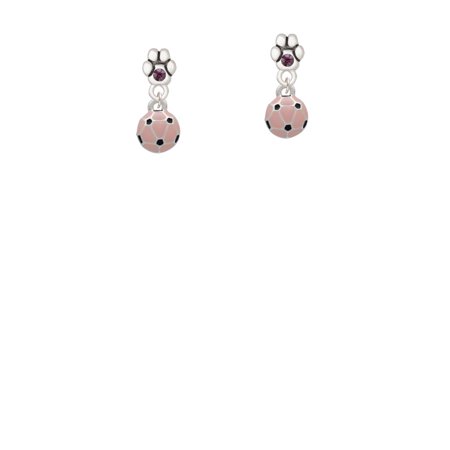 Silver Tone Mini Pink Soccerball - Purple Crystal Paw Earrings. Silver Tone, hand enameled charms. Charm size is approx. 0.5 x 0.37 x 0.17 inches (HxWxD) including loop. Paw Earring is approx. 0.34 x 0.30 x 0.08 inches (HxWxD) not including dangle. Earrings have steel posts. Earring backs are Bullet ''Clutch'' Style with Plastic Pad. Earring crystal colors available: Red, Yellow, Green, Blue, Purple, Light Pink, Black, and Clear. Great for sports teams! Lovely gift for dog and cat lovers. PLEASE NOTE: Our products are lead safe, but are not intended for children 14 years and younger.