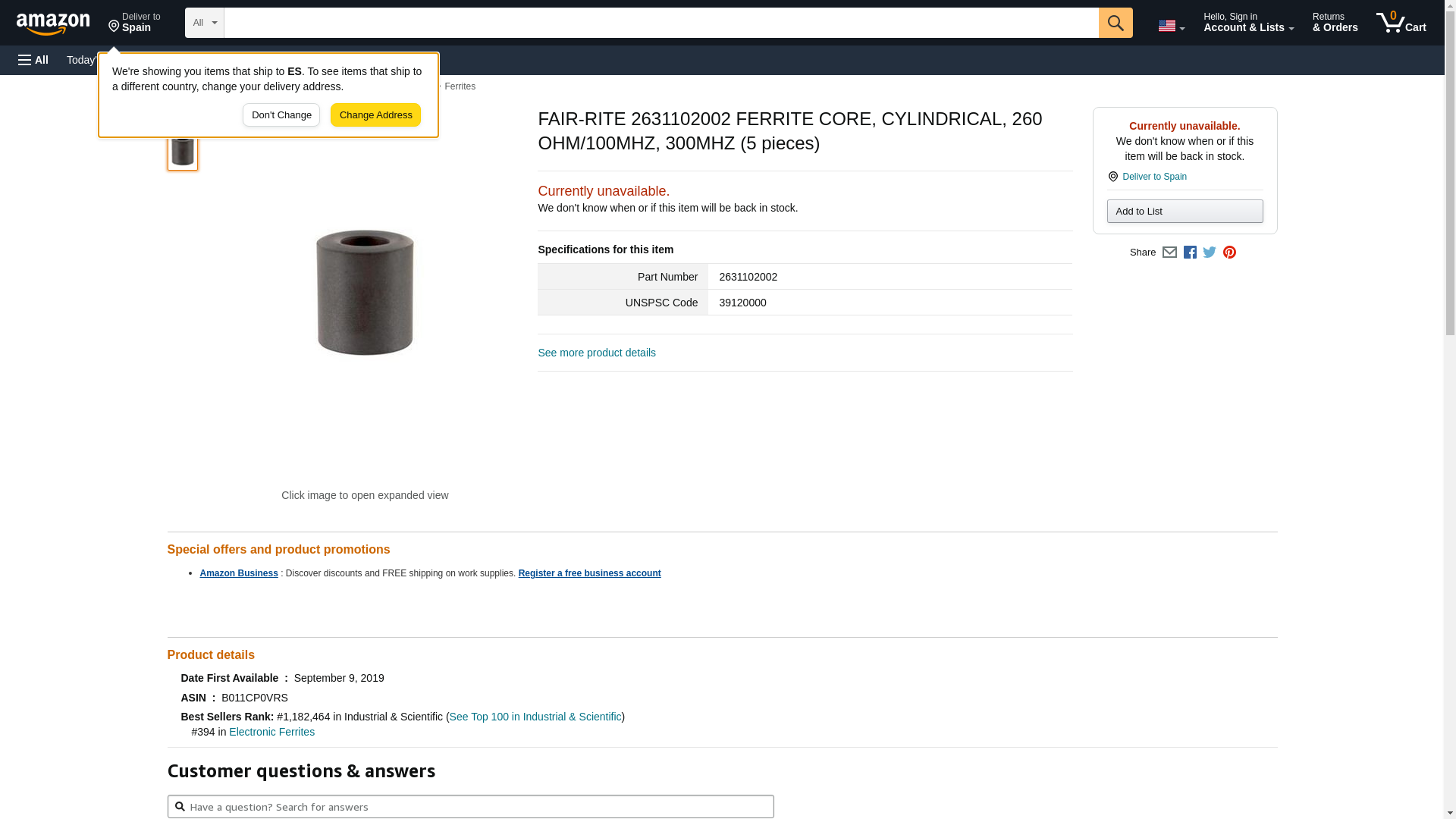 | Feature | FAIR-RITE 2631102002 FERRITE CORE, CYLINDRICAL, 260 OHM/100MHZ, 300MHZ |