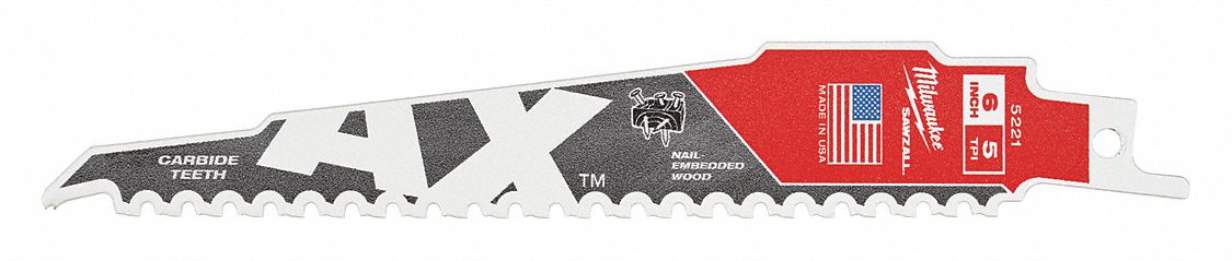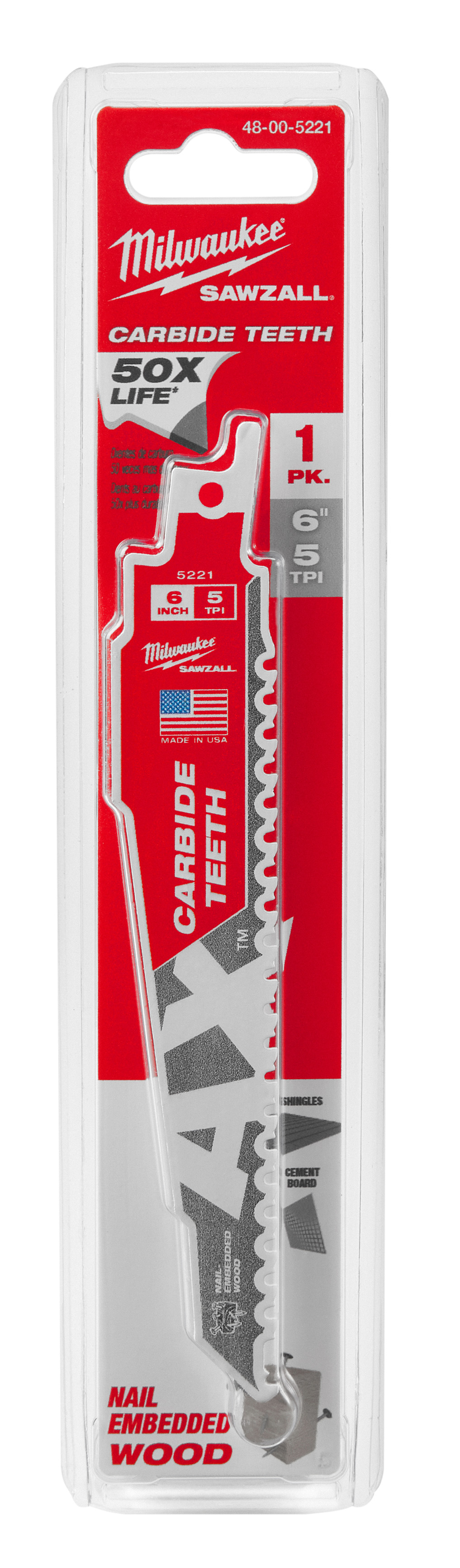 The Ax with Carbide Teeth, engineered to deliver long life in the toughest applications while being the fastest carbide-tipped reciprocating saw blades on the market. These new blades will deliver 30X longer life over standard bi-metal blades and 2X faster cutting than other carbide blades. The Ax with Carbide Teeth features optimized carbide tipping technology that delivers extreme life. A fast, aggressive 5 TPI blade design allows for the fastest cutting in nail-embedded wood and a wide range of residential material. In addition, The Ax with Carbide Teeth will feature Milwaukee patented features Nail Guard and Fang Tip. Nail Guard allows the user to Rip Nails Not Teeth, delivering extreme durability. The Fang Tip provides the fastest plunging on any wood cutting blade on the market. The Ax with Carbide Teeth is optimized for Cordless Reciprocating Saws delivering over 25% more cuts per charge.