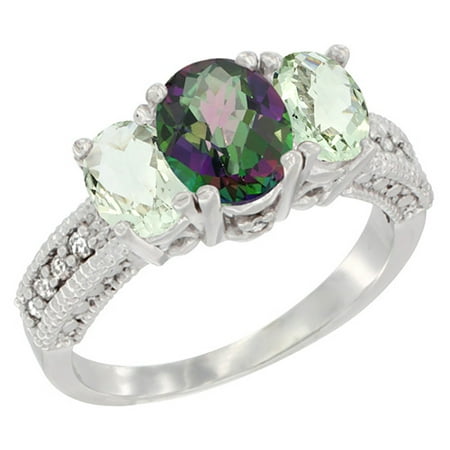 10K White Gold Diamond Natural Mystic Topaz Ring Oval 3-stone with Green Amethyst, sizes 5 - 10