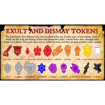 Designed specifically for Darklands, this Darklands Exult and Dismay Tokens Set gives you seventy exult and dismay tokens that are attached to a unit where necessary, ensuring each player instantly knows that unit's status. <br /> <br /> <b>This contains:</b> <br /> <br /> <b>41x Exult Tokens</b> <br /> <br /> <li>5x Frenzied Token<br /></li> <li>5x Exulted Tokens<br /></li> <li>10x 1x Blood Token<br /></li> <li>4x 5x Blood Tokens<br /></li> <li>1x 10x Blood Tokens<br /></li> <li>1x Strong Token<br /></li> <li>1x Swift Token<br /></li> <li>1x Ambush Token<br /></li> <li>1x Host Banner Token<br /></li> <li>3x Banner Tokens<br /></li> <li>3x Hold Tokens<br /></li> <li>3x Shieldwall Tokens<br /></li> <li>3x Braced Tokens<br /><br /><b>29x Dismay Tokens</b><br /><br /></li> <li>5x Confused Tokens<br /></li> <li>5x Shaken Tokens<br /></li> <li>3x Afraid Tokens<br /></li> <li>3x Blind Beset Tokens<br /></li> <li>10x Defeated Tokens<br /></li> <li>3x Broken Tokens</li>