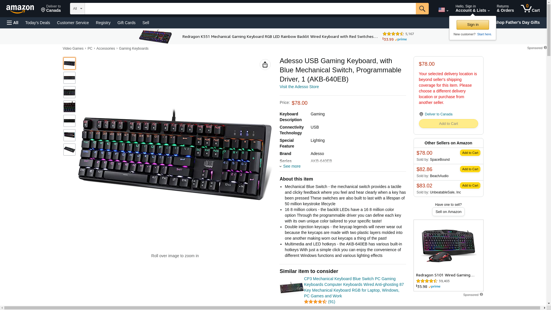 Adesso USB Gaming Keyboard, with Blue Mechanical Switch, Programmable Driver, 1 (AKB-640EB)