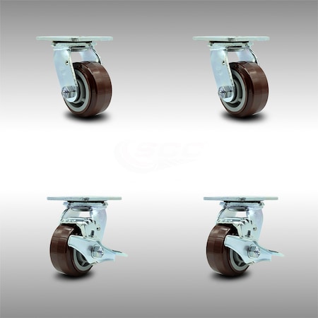 Stainless Steel Polyurethane on Polyolefin Swivel Top Plate Caster Set of 4 w/4" x 2" Maroon Wheels - Includes 2 Swivel with Brakes & 2 Swivel - 2400 lbs Total Capacity - Service Caster Brand