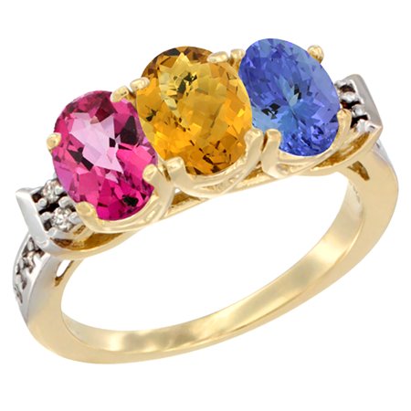 10K Yellow Gold Natural Pink Topaz, Whisky Quartz & Tanzanite Ring 3-Stone Oval 7x5 mm Diamond Accent, sizes 5 - 10