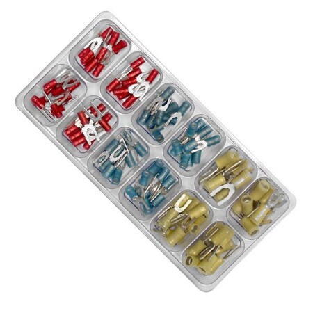 AMP PIDG TERMINAL KIT; Connector Kit Type:Terminals & Splices; Kit Contents:120-Pcs of 1/4, 4, 6, 8, 10 Stud Size Pre-Insulated Long Spring Spade Tongue Terminals; Product Range:PIDG Series RoHS Compliant: Yes