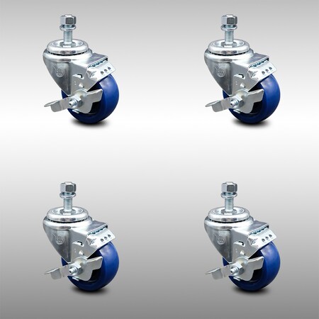 Stainless Steel Solid Polyurethane Swivel Threaded Stem Caster Set of 4 w/3.5" x 1.25" Blue Wheels and 3/8" Stems - Includes 4 with Top Lock Brakes - 1200 lbs Total Capacity - Service Caster Brand