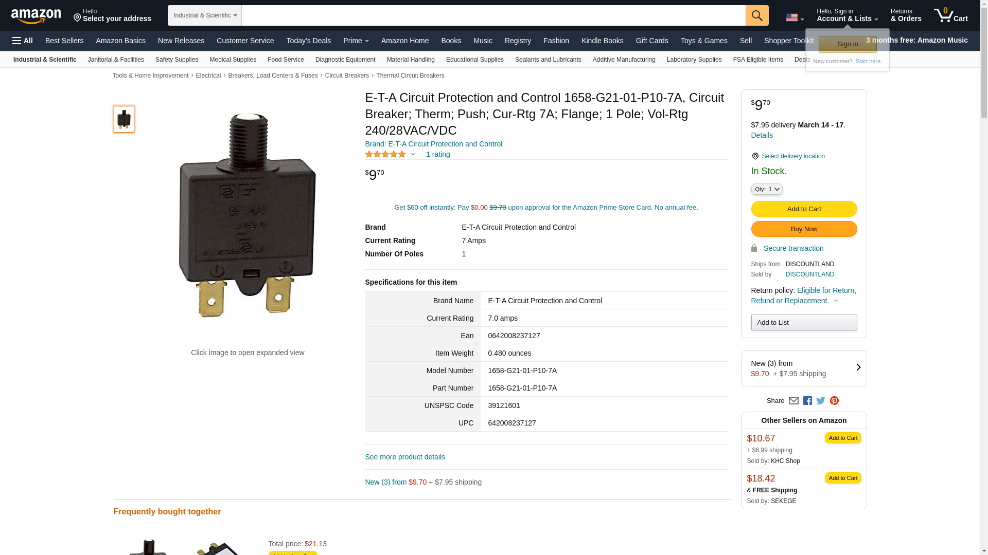 E-T-A Circuit Protection and Control 1658-G21-01-P10-7A, Circuit Breaker; Therm; Push; Cur-Rtg 7A; Flange; 1 Pole; Vol-Rtg 240/28VAC/VDC