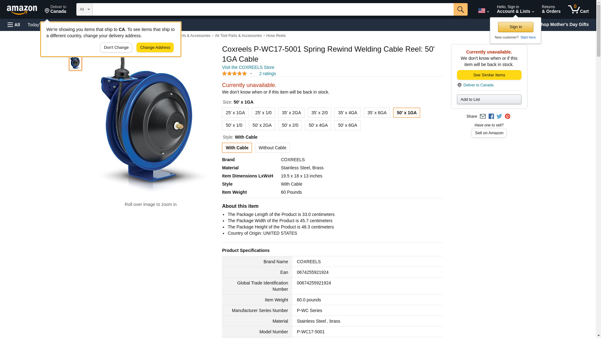 Coxreels P-WC17-5001 Spring Rewind Welding Cable Reel: 50' 1GA Cable