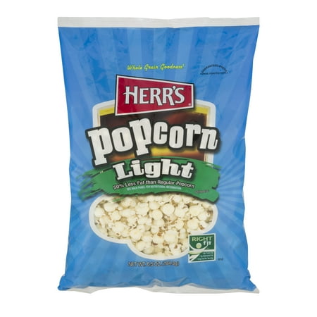 <ul> <li>Herr's Light Popcorn.</li> <li>Whole grain goodness!.</li> <li>Guaranteed fresh until printed date.</li> <li>50% less fat than regular popcorn.</li> <li>See back panel for nutritional information.</li> <li>Right Fit.</li> <li>0g trans fat.</li> <li>1g saturated fat.</li> <li>3.5g fat per serving.</li> <li>Net wt.</li> <li>6.5 oz.</li> <li>(184.3g).</li> <li>Kosher</li> </ul>