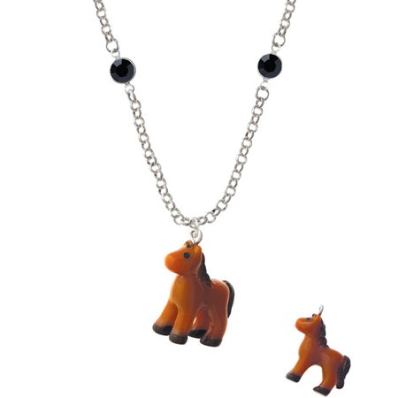 Hand Painted Resin Brown Pony Black Crystal Fiona Necklace. Resin Brown Pony is approximately 1.00 x 0.36 x 0.89 inches (HxWxD). Light weight alternative to metal charms. 3mm Belcher Chain with 4 - 6mm Swarovski Crystal Channel Links. Necklace: 20-22 Inches Adjustable with a Lobster Claw Clasp. This beautiful necklace is elegant with a touch a color for a personalized look. We are a family owned company in the U.S.A. since 1977. PLEASE NOTE: Our products are lead safe, but are not intended for children 14 years and younger.