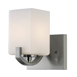 - The Palmer has a contemporary flair that blends sharp edges and smooth lines, brushed nickel finish and white flat opal glass complete the look