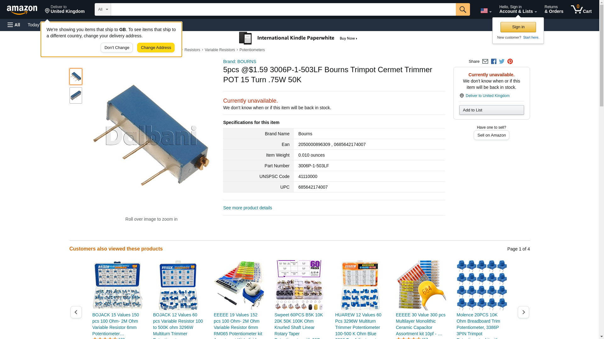 | Feature | BOURNS 3006P-1-503LF TRIMMER, POTENTIOMETER, 50KOHM 15TURN THRU HOLE |