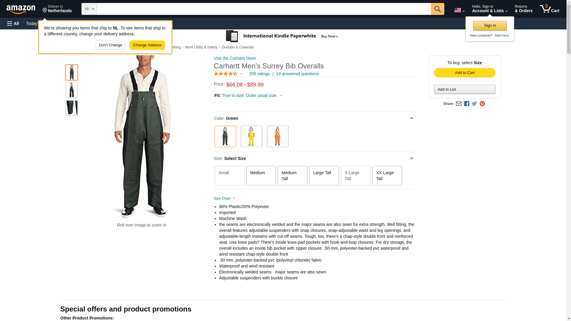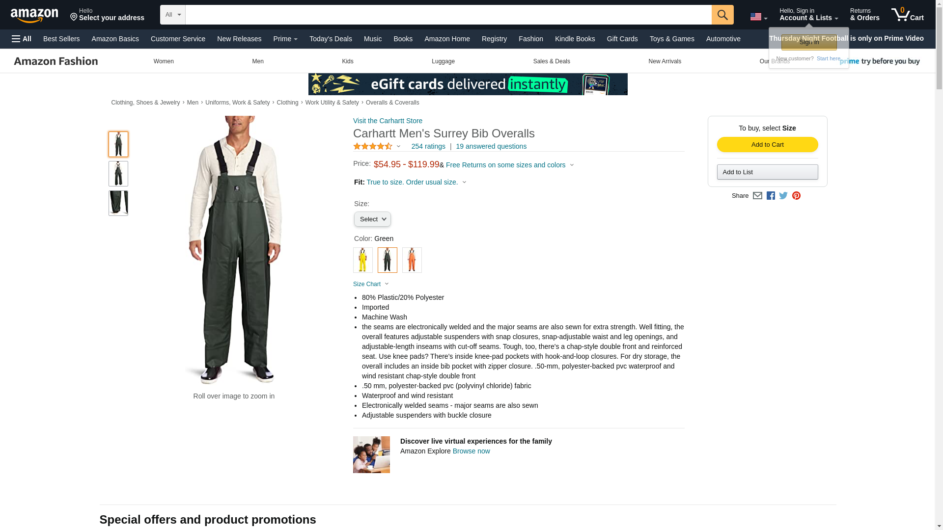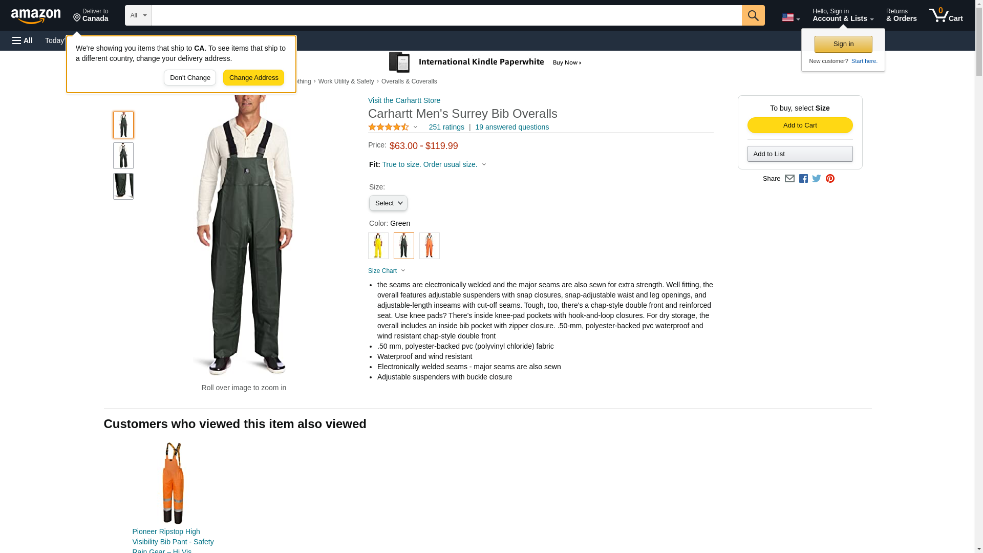 The forecast calls for rain and wind all day. While you� d prefer to stay indoors curled up with a good book (o.k., lounging in your recliner watching sports), you have to work. If you think going to work on a dreary, rainy day is a drag, try having to work IN the rain. We can� t make the rain go away, but we can offer you the waterproof Carhartt Men� s 100101 300 Surrey Rain Bib Overalls.Made of 50-milimeter, polyester-backed PVC (polyvinyl chloride) fabric, these green overalls are waterproof and wind resistant. Wearing these Carhartt overalls in the rain will help to keep you drier and make your day more bearable. In addition to the material being waterproof, all the seams are electronically welded and all the major seams are also sewn for extra strength. With this construction, the rain can try to get in but it won� t stand a chance. And the wind can huff and puff all it wants, but it won� t get these waterproof overalls down. For even more durability, there� s a chap-style double front and reinforced seat. The reinforced seat sounds like a great ideas for your plumber friend. In addition to keeping the elements out, these durable waterproof overalls are all about fit and ease-of-wear. To give you a more customized fit, the Carhartt bib overalls feature adjustable suspenders with snap closure, snap-adjustable waist and leg openings, and adjustable-length inseams with cut-off seams. Use knee pads? There are inside knee-pad pockets with hook-and-loop closures. Keep your phone or other important items safe and dry in the inside bib pocket with zipper closure.When the forecast calls for rain and wind, don� t curse at the meteorologist. Make your day more bearable by wearing a pair of Carhartt Men� s 100101 300 Surrey Rain Bib Overalls.Manufactured Sizes: Regular S-4XL | Tall M-3XL