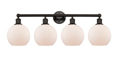 INNOVATIONS 616-4W-OB-G121-8 Athens 4 35 inch Bath Vanity Light Oil Rubbed Bronze. Style: Industrial, Modern Contempo, Restoration-Vintage, Transitional . Collection Name: Downtown Urban. Metal Finish(Body): Oil Rubbed Bronze. Metal Finish(Shade): Matte White. Material: Steel, Cast Brass, Glass. Dimension(in): 13(H) x 35(W) x 8.5(Ext). Bulb: (4)60W Medium Base Incandescent(Not Included). Voltage: 120. Dimmable: Yes. Color Temperature (Kelvin): 2200. Color Rendering Index (CRI): 99.9. Lumens: 220. Life Expectancy (Hours): 2000. Glass Shade Description: Matte White Athens. Glass Type: Frosted. Shade Shape: Globe/Orb. Glass or Metal Shade Color: Matte White. Shade Material: Glass. Shade Dimension(in): 8(W) x 7(H). Fitter Measurement (Glass Or Metal Shade Fitter Size): Neckless with a 1.75 inch opening. ADA Compliant: No. California Proposition 65 Warning Required: Yes. UL/ETL Certification Type: Damp Location.