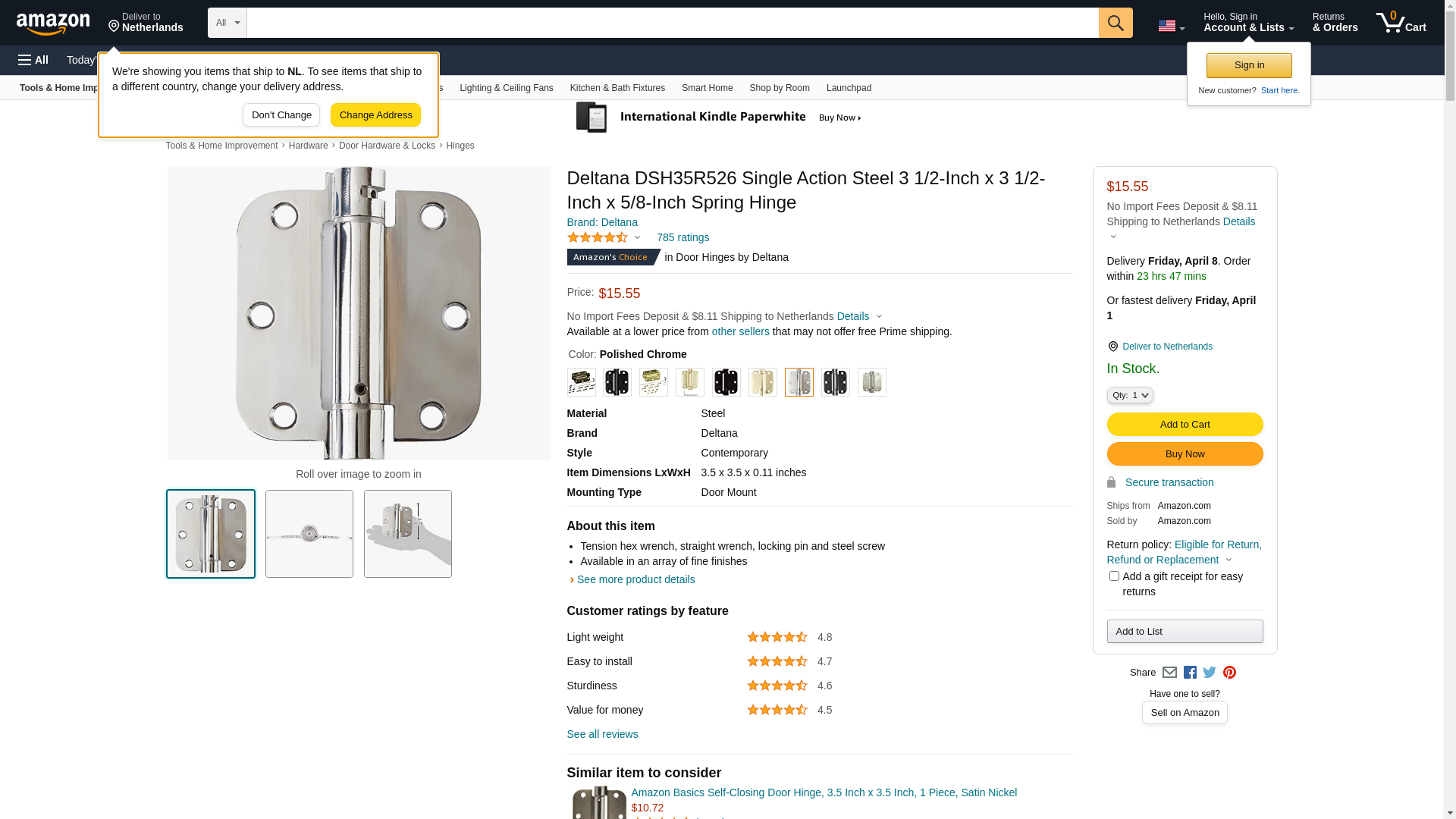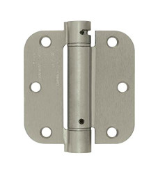 Spring Hinges Collection Deltana 5/8" Radius Corner 3.5" x 3.5" Steel Spring Hinge Mortise Hinge - Single Nothing less than excellence can be expected from a Deltana spring hinge. Featuring an adjustable spring mechanism, these hinges offer discrete beauty to your home or business that can't be found with anyone else. Features: Sold as Single Hinge Spring Hinge Residential Strength Removable Pin: No Wood Screws Included 5/8" Radius Corners Traditional / Classic Theme Arc Hole Pattern Spring Hinge : These single action hinges are fitted with springs in the barrel to bring an open door back to a closed position automatically. Great where door space is at a premium and door closers are impractical. With double action hinges, the door is able to move in either direction. Material - Steel : Steel is cheap strong and durable making it a favorite for hinges of all types. Though it is more prone to rusting than solid brass or stainless steel. Mounting : The standard corners for mortised door hinges are 1/4" radius, 5/8" radius and square corner. It is recommended that three hinges be used on doors up to and including 7.5 feet with one additional hinge for each additional 2.5 feet. Make sure you check your current hinges before making a purchase. Specifications: 3.5 Inch Height 3.5 Inch Width Made from Steel Mount: Mortise Gauge: 0.097" (Thickness of Hinge Steel) 3 Knuckles 6 Screw holes Deltana is the architectural hardware manufacturer with a proven record for exceptional service and quality. Deltana inventories the country's largest selection of architectural, lighting, and door hardware in over nine fine finishes made from solid brass, zinc, aluminum, steel and stainless steel. Additional Deltana Information DSH35R5 Specification Sheet View Deltana Manufacturer Warranty Shop All Deltana Products Do not use prints made from this website to mark distances. Due to individual printers, dimensions on installation instructions