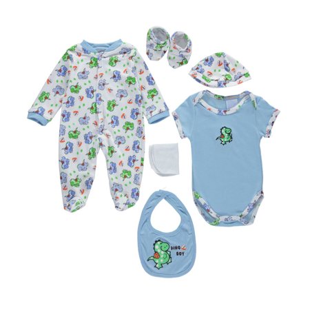 This 7-piece set from Take Me Home offers quality and comfort. Take Me Home 7-piece layette set Jersey lap collar bodysuit with contrast trim, applique at chest, and easy-change snaps (60% cotton, 40% polyester) Jersey footed coverall with 3/4 sleeves, contrast trim, and easy-change snaps (60% cotton, 40% polyester) Jersey cap (materials and care unlisted) Jersey bib with ribbed trim, applique, and snap closure (materials and care unlisted) Jersey washcloth (materials and care unlisted) Jersey booties (materials and care unlisted) Mesh garment bag (materials and care unlisted) Machine wash warm Imported