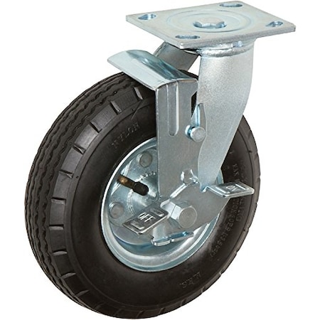 10 Inch Pneumatic Caster: CasterHQ's industrial pneumatic casters feature high quality air filled pneumatic wheels. These industrial casters are designed for low speed manually moved applications only. Air filled pneumatic wheels provide a cushioned ride, shock absorption and quiet operation. Pneumatic casters are ideally suited for moving fragile or delicate cargo where caster overall height is not critical. Casters with pneumatic wheels are usually the best choice for use outdoors over rough surfaces ( i.e. gravel ) , grass, or anywhere there are obstacles that need to be easily rolled over. The wide footprint on 8" or larger pneumatic wheels provides stability on gravel and does not sink into lawns. Pneumatic casters and pneumatic wheels are also popular for indoor use in places such as hospitals, scientific and electronic laboratories, hotels, department stores and TV or movie studios. Pneumatic wheels with black tires does not mark the floor as long as the wheel is allowed to roll freely. Changing directions without allowing a swivel caster to turn gradually around, or dragging a black rubber wheel sideways, can mark some floors.