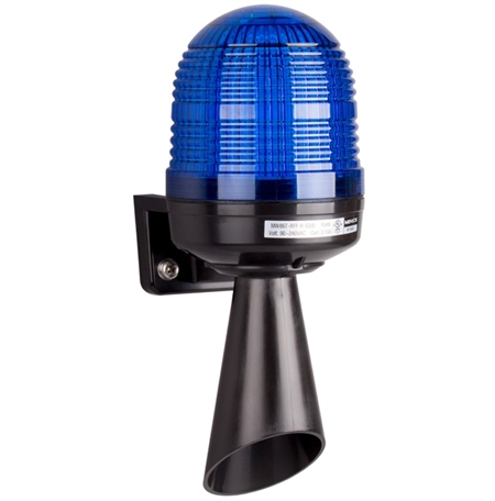 Menics MW86T-R00-B-M3B 86mm wall mount LED beacon light is 12-24V DC. Blue lens. 3 melody modes. Comes with removable black horn attachment.